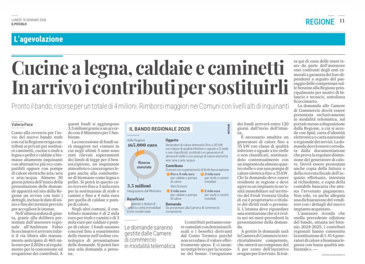 La Regione Friuli Venezia Giulia ha stanziato 4 milioni di euro per incentivare la sostituzione di generatori di calore domestici a biomassa legnosa di bassa qualità emissiva nei comuni dove negli ultimi cinque anni sono stati rilevati sforamenti di benzoapirene.